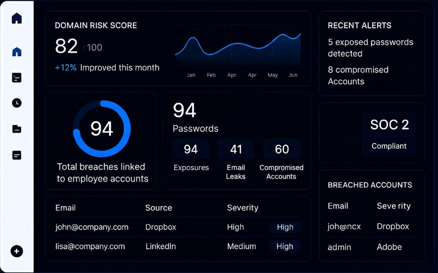 As B2B SaaS teams grow, their domain-level footprint expands quickly — across employees, tools, vendors, and services tied to the company domain.Over time, some of that exposure becomes visible outside the organization — through reused credentials, third-party breaches, misconfigured email authentication, or overlooked domain infrastructure.Before SOC 2, most teams don’t yet have continuous, independently verifiable visibility into these signals.Not because they’re negligent — but because formal compliance, monitoring, and reporting typically mature later than growth.The result is a trust gap: